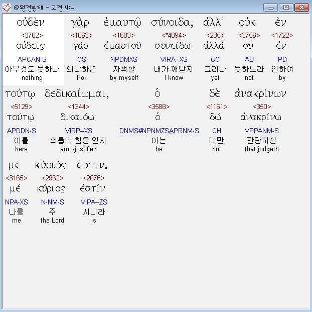 헬라어신약Stephanos,4 ουδεν γαρ εμαυτω συνοιδα αλλ ουκ εν τουτω δεδικαιωμαι ο δε ανακρινων με κυριος εστιν