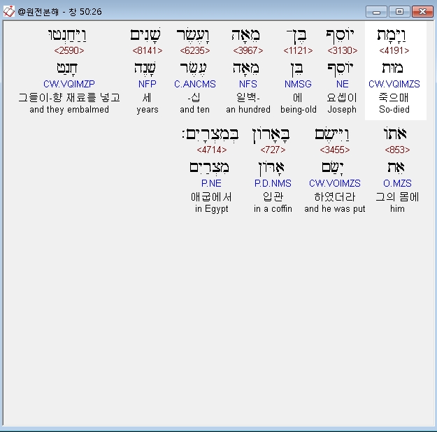 히브리어구약BHS,26 וַיָּמָת יֹוסֵף בֶּן־מֵאָה וָעֶשֶׂר שָׁנִים וַיַּחַנְטוּ אֹתֹו וַיִּישֶׂם בָּאָרֹון בְּמִצְרָיִם׃
