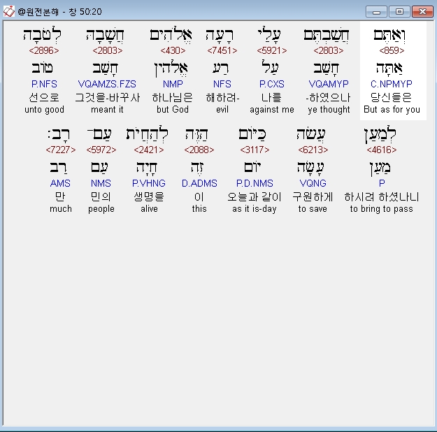 히브리어구약BHS,20 וְאַתֶּם חֲשַׁבְתֶּם עָלַי רָעָה אֱלֹהִים חֲשָׁבָהּ לְטֹבָה לְמַעַן עֲשֹׂה כַּיֹּום הַזֶּה לְהַחֲיֹת עַם־רָב׃