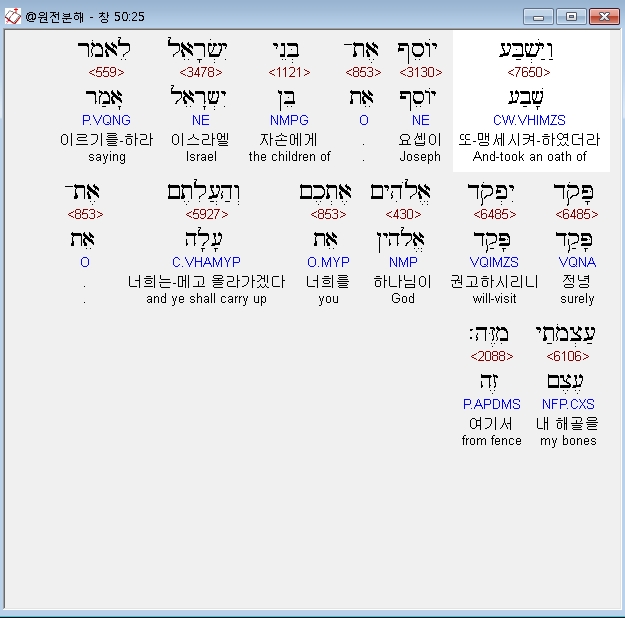 히브리어구약BHS,25 וַיַּשְׁבַּע יֹוסֵף אֶת־בְּנֵי יִשְׂרָאֵל לֵאמֹר פָּקֹד יִפְקֹד אֱלֹהִים אֶתְכֶם וְהַעֲלִתֶם אֶת־עַצְמֹתַי מִזֶּה׃