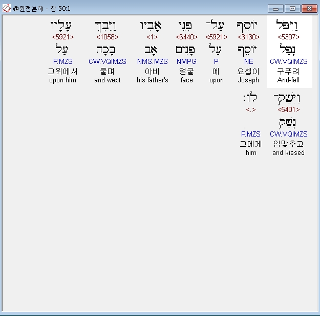히브리어구약BHS,1 וַיִּפֹּל יֹוסֵף עַל־פְּנֵי אָבִיו וַיֵּבְךְּ עָלָיו וַיִּשַּׁק־לֹו׃