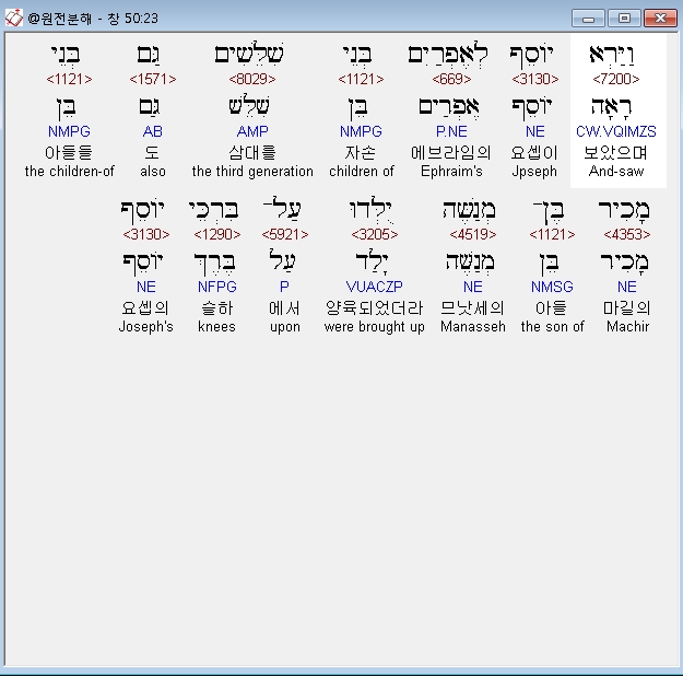 히브리어구약BHS,23 וַיַּרְא יֹוסֵף לְאֶפְרַיִם בְּנֵי שִׁלֵּשִׁים גַּם בְּנֵי מָכִיר בֶּן־מְנַשֶּׁה יֻלְּדוּ עַל־בִּרְכֵּי יֹוסֵף׃