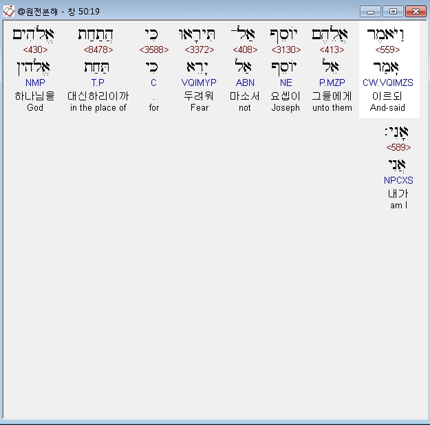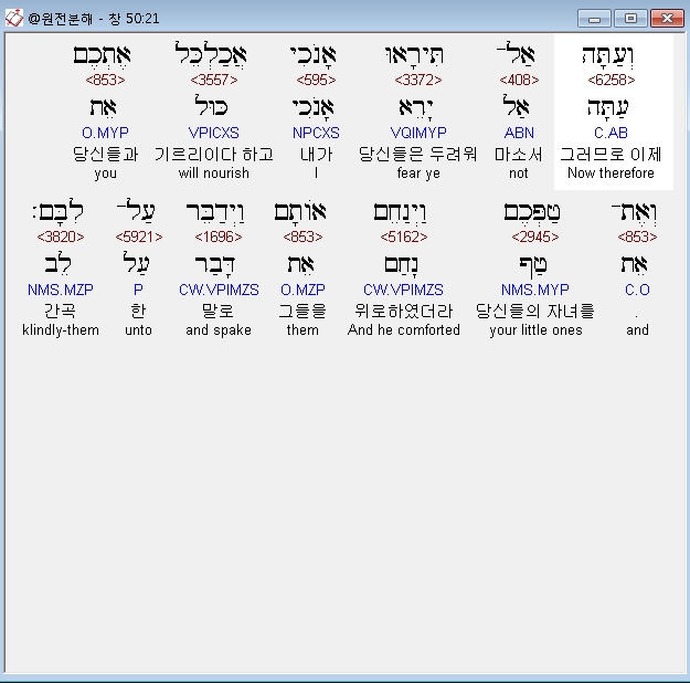 히브리어구약BHS,21 וְעַתָּה אַל־תִּירָאוּ אָנֹכִי אֲכַלְכֵּל אֶתְכֶם וְאֶת־טַפְּכֶם וַיְנַחֵם אֹותָם וַיְדַבֵּר עַל־לִבָּם׃