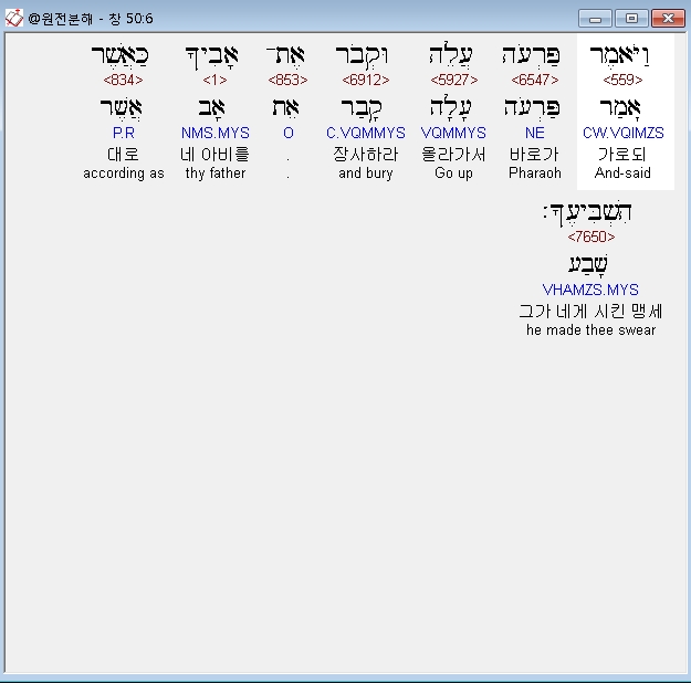히브리어구약BHS,6 וַיֹּאמֶר פַּרְעֹה עֲלֵה וּקְבֹר אֶת־אָבִיךָ כַּאֲשֶׁר הִשְׁבִּיעֶךָ׃