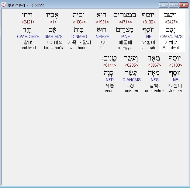 히브리어구약BHS,22 וַיֵּשֶׁב יֹוסֵף בְּמִצְרַיִם הוּא וּבֵית אָבִיו וַיְחִי יֹוסֵף מֵאָה וָעֶשֶׂר שָׁנִים׃