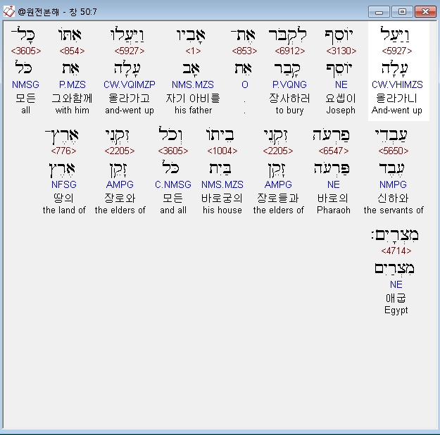 헬라어구약Septuagint,7 και ανεβη ιωσηφ θαψαι τον πατερα αυτου και συνανεβησαν μετ' αυτου παντες οι παιδες φαραω και οι πρεσβυτεροι του οικου αυτου και παντες οι πρεσβυτεροι της γης αιγυπτου