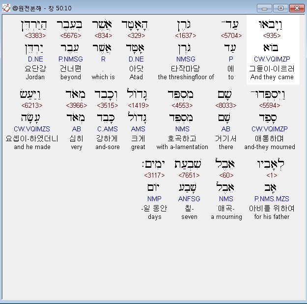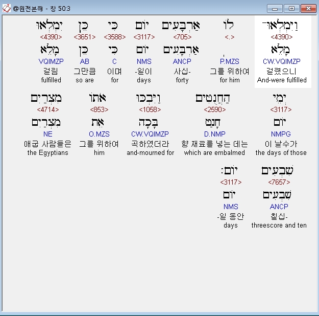 히브리어구약BHS,3 וַיִּמְלְאוּ־לֹו אַרְבָּעִים יֹום כִּי כֵּן יִמְלְאוּ יְמֵי הַחֲנֻטִים וַיִּבְכּוּ אֹתֹו מִצְרַיִם שִׁבְעִים יֹום׃