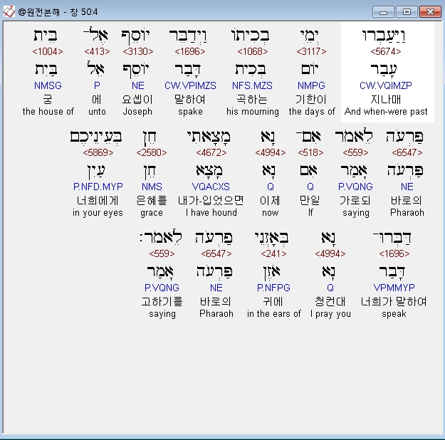 영어NASB,4 And when the days of mourning for him were past, Joseph spoke to the household of Pharaoh, saying, "If now I have found favor in your sight, please speak to Pharaoh, saying,