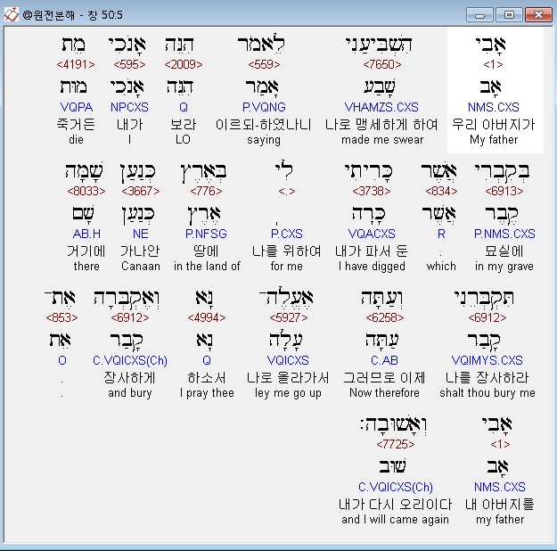 히브리어구약BHS,5 אָבִי הִשְׁבִּיעַנִי לֵאמֹר הִנֵּה אָנֹכִי מֵת בְּקִבְרִי אֲשֶׁר כָּרִיתִי לִי בְּאֶרֶץ כְּנַעַן שָׁמָּה תִּקְבְּרֵנִי וְעַתָּה אֶעֱלֶה־נָּא וְאֶקְבְּרָה אֶת־אָבִי וְאָשׁוּבָה׃