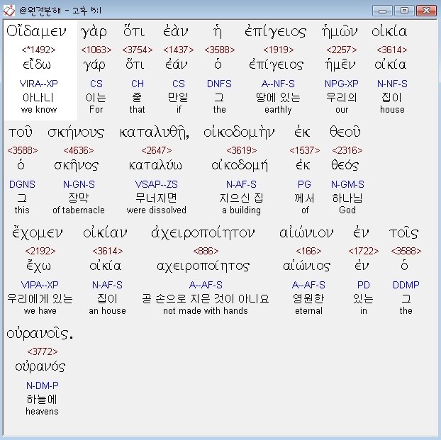 헬라어신약Stephanos,1 οιδαμεν γαρ οτι εαν η επιγειος ημων οικια του σκηνους καταλυθη οικοδομην εκ θεου εχομεν οικιαν αχειροποιητον αιωνιον εν τοις ουρανοις