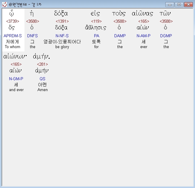 아멘 - 헬라어 '아멘'(*)은 히브리어(*, 아멘)에서 유래되었다. 바울에게 있어서 아멘은 하나님께 대한 찬양이나 서신서의 결미어로 사용되었다(롬16:27;빌 4:20 등). 본절에서 '아멘'은 하나님께 대한 찬양과 영광이 영원히 있을 것이라는 점을 강조하며, '이 악한 세대'의 일시적이며 덧없는 속성과 선명한 대조를 보여준다.