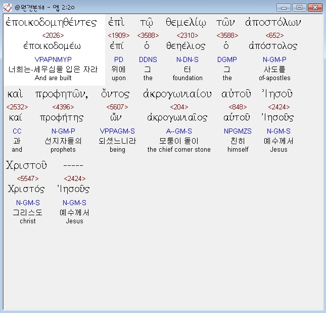 헬라어신약Stephanos,20 εποικοδομηθεντες επι τω θεμελιω των αποστολων και προφητων οντος ακρογωνιαιου αυτου ιησου χριστου