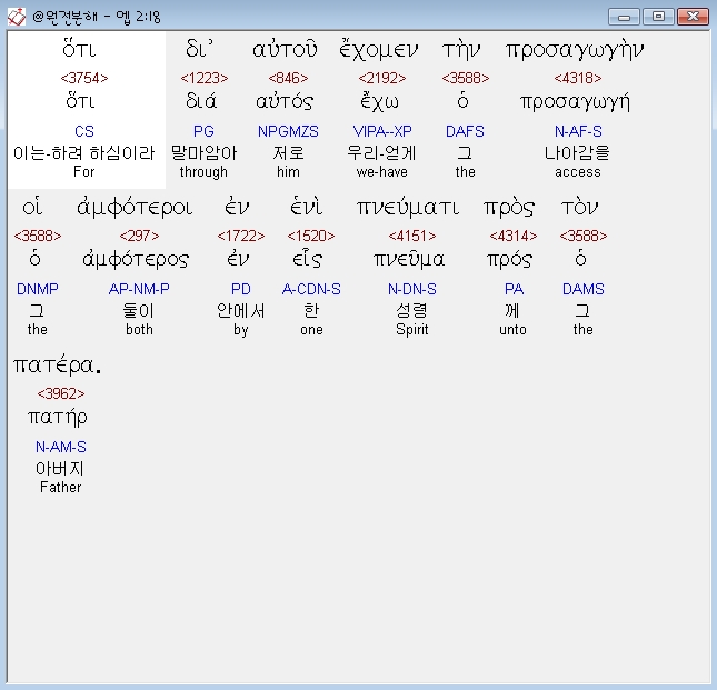 헬라어신약Stephanos,18 οτι δι αυτου εχομεν την προσαγωγην οι αμφοτεροι εν ενι πνευματι προς τον πατερα