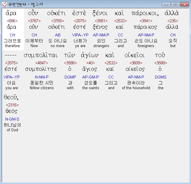 헬라어신약Stephanos,19 αρα ουν ουκετι εστε ξενοι και παροικοι αλλα συμπολιται των αγιων και οικειοι του θεου