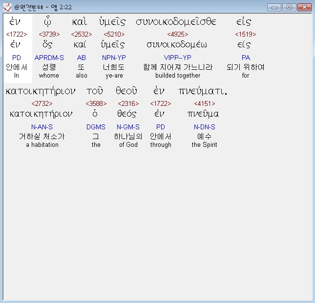 헬라어신약Stephanos,22 εν ω και υμεις συνοικοδομεισθε εις κατοικητηριον του θεου εν πνευματι