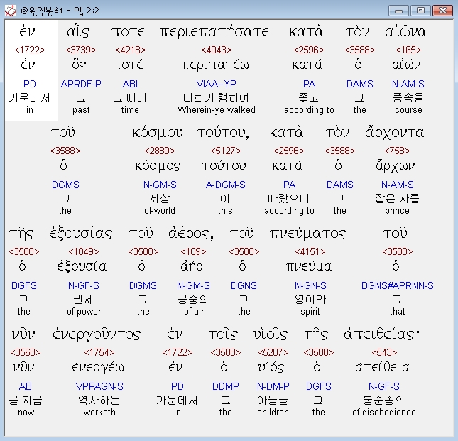 헬라어신약Stephanos,2 εν αις ποτε περιεπατησατε κατα τον αιωνα του κοσμου τουτου κατα τον αρχοντα της εξουσιας του αερος του πνευματος του νυν ενεργουντος εν τοις υιοις της απειθειας