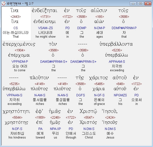 히나 엔데잌세타이 엔 토이스 아이오신 토이스 에페르코메노이스 토 휘페르발론 플루토스 테스 카리토스 아우투 엔 크레스토테티 엪 헤마스 엔 크리스토 예수