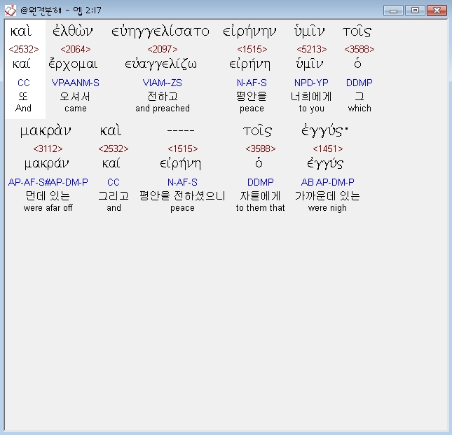 | 엡 2:17 |(엘돈 유엥겔리사토 에이레넨 휘민토이스 마크란 카이 에이레넨 토이스 |