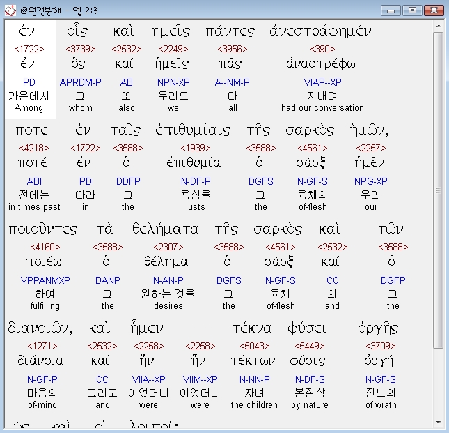 헬라어신약Stephanos,3 εν οις και ημεις παντες ανεστραφημεν ποτε εν ταις επιθυμιαις της σαρκος ημων ποιουντες τα θεληματα της σαρκος και των διανοιων και ημεν τεκνα φυσει οργης ως και οι λοιποι
