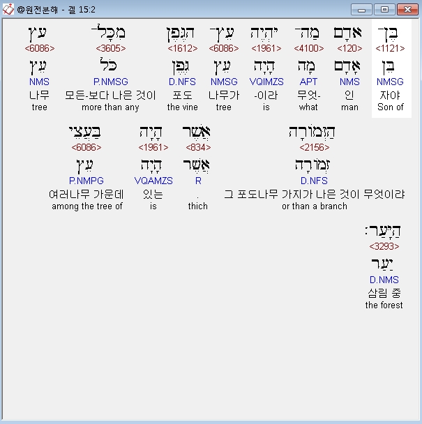 히브리어구약BHS,2 בֶּן־אָדָם מַה־יִּהְיֶה עֵץ־הַגֶּפֶן מִכָּל־עֵץ הַזְּמֹורָה אֲשֶׁר הָיָה בַּעֲצֵי הַיָּעַר׃