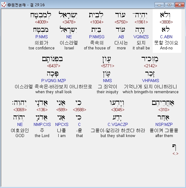 히브리어구약BHS,16 וְלֹא יִהְיֶה־עֹוד לְבֵית יִשְׂרָאֵל לְמִבְטָח מַזְכִּיר עָוֹן בִּפְנֹותָם אַחֲרֵיהֶם וְיָדְעוּ כִּי אֲנִי אֲדֹנָי יְהוִה׃ ף