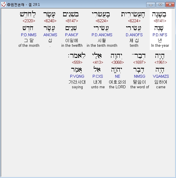 히브리어구약BHS,1 בַּשָּׁנָה הָעֲשִׂירִית בָּעֲשִׂרִי בִּשְׁנֵים עָשָׂר לַחֹדֶשׁ הָיָה דְבַר־יְהוָה אֵלַי לֵאמֹר׃
