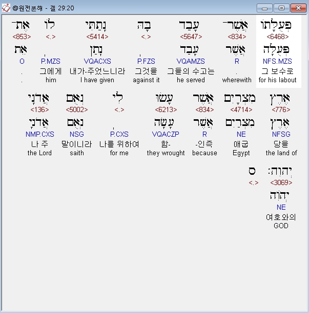히브리어구약BHS,20 פְּעֻלָּתֹו אֲשֶׁר־עָבַד בָּהּ נָתַתִּי לֹו אֶת־אֶרֶץ מִצְרָיִם אֲשֶׁר עָשׂוּ לִי נְאֻם אֲדֹנָי יְהוִה׃ ס