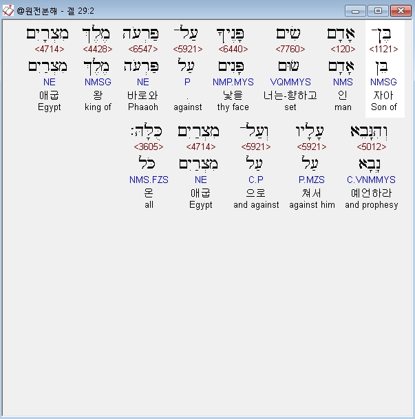 히브리어구약BHS,2 בֶּן־אָדָם שִׂים פָּנֶיךָ עַל־פַּרְעֹה מֶלֶךְ מִצְרָיִם וְהִנָּבֵא עָלָיו וְעַל־מִצְרַיִם כֻּלָּהּ׃