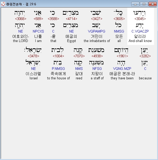 히브리어구약BHS,6 וְיָדְעוּ כָּל־יֹשְׁבֵי מִצְרַיִם כִּי אֲנִי יְהוָה יַעַן הֱיֹותָם מִשְׁעֶנֶת קָנֶה לְבֵית יִשְׂרָאֵל׃