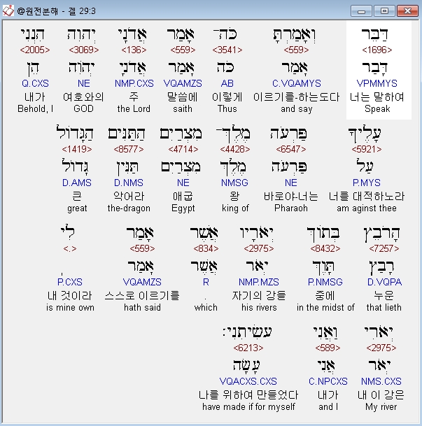 히브리어구약BHS,3 דַּבֵּר וְאָמַרְתָּ כֹּה־אָמַר אֲדֹנָי יְהוִה הִנְנִי עָלֶיךָ פַּרְעֹה מֶלֶךְ־מִצְרַיִם הַתַּנִּים הַגָּדֹול הָרֹבֵץ בְּתֹוךְ יְאֹרָיו אֲשֶׁר אָמַר לִי יְאֹרִי וַאֲנִי עֲשִׂיתִנִי׃