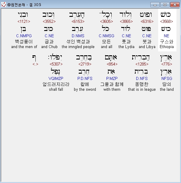 히브리어구약BHS,5 כּוּשׁ וּפוּט וְלוּד וְכָל־הָעֶרֶב וְכוּב וּבְנֵי אֶרֶץ הַבְּרִית אִתָּם בַּחֶרֶב יִפֹּלוּ׃ ף