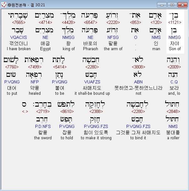 히브리어구약BHS,21 בֶּן־אָדָם אֶת־זְרֹועַ פַּרְעֹה מֶלֶךְ־מִצְרַיִם שָׁבָרְתִּי וְהִנֵּה לֹא־חֻבְּשָׁה לָתֵת רְפֻאֹות לָשׂוּם חִתּוּל לְחָבְשָׁהּ לְחָזְקָהּ לִתְפֹּשׂ בֶּחָרֶב׃ ס