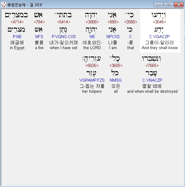 히브리어구약BHS,26 וַהֲפִצֹותִי אֶת־מִצְרַיִם בַּגֹּויִם וְזֵרִיתִי אֹותָם בָּאֲרָצֹות וְיָדְעוּ כִּי־אֲנִי יְהוָה׃ ס개역개정,26 내가 애굽 사람을 나라들 가운데로 흩으며 백성들 가운데로 헤치리니 내가 여호와인 줄을 그들이 알리라