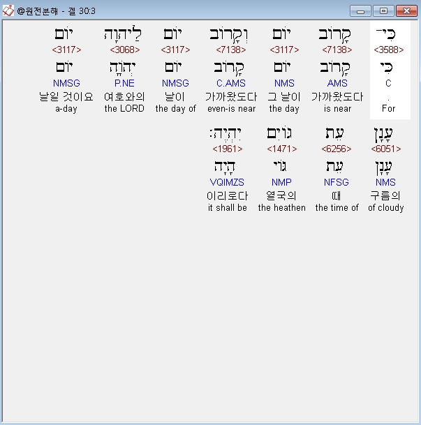 히브리어구약BHS,3 כִּי־קָרֹוב יֹום וְקָרֹוב יֹום לַיהוָה יֹום עָןָן עֵת גֹּויִם יִהְיֶה׃