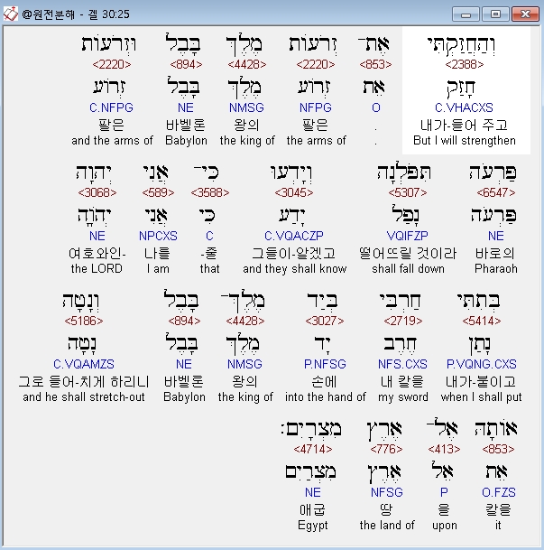 히브리어구약BHS,25 וְהַחֲזַקְתִּי אֶת־זְרֹעֹות מֶלֶךְ בָּבֶל וּזְרֹעֹות פַּרְעֹה תִּפֹּלְנָה וְיָדְעוּ כִּי־אֲנִי יְהוָה בְּתִתִּי חַרְבִּי בְּיַד מֶלֶךְ־בָּבֶל וְנָטָה אֹותָהּ אֶל־אֶרֶץ מִצְרָיִם׃