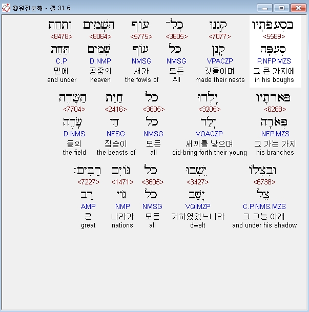 히브리어구약BHS,6 בִּסְעַפֹּתָיו קִנְנוּ כָּל־עֹוף הַשָּׁמַיִם וְתַחַת פֹּארֹתָיו יָלְדוּ כֹּל חַיַּת הַשָּׂדֶה וּבְצִלֹּו יֵשְׁבוּ כֹּל גֹּויִם רַבִּים׃