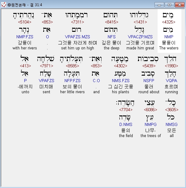 영어NASB,4 'The waters made it grow, the deep made it high. With its rivers it continually extended all around its planting place, And it sent out its channels to all the trees of the field.