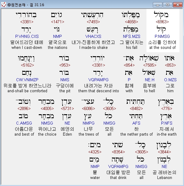 히브리어구약BHS,16 מִקֹּול מַפַּלְתֹּו הִרְעַשְׁתִּי גֹויִם בְּהֹורִדִי אֹתֹו שְׁאֹולָה אֶת־יֹורְדֵי בֹור וַיִּנָּחֲמוּ בְּאֶרֶץ תַּחְתִּית כָּל־עֲצֵי־עֵדֶן מִבְחַר וְטֹוב־לְבָנֹון כָּל־שֹׁתֵי מָיִם׃