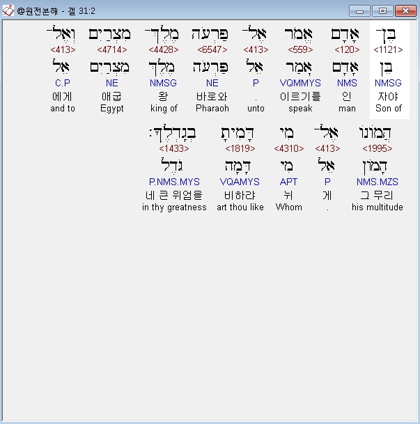 히브리어구약BHS,2 בֶּן־אָדָם אֱמֹר אֶל־פַּרְעֹה מֶלֶךְ־מִצְרַיִם וְאֶל־הֲמֹונֹו אֶל־מִי דָּמִיתָ בְגָדְלֶךָ׃