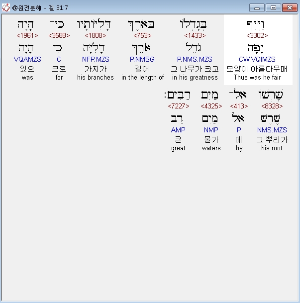 헬라어구약Septuagint,7 και εγενετο καλος εν τω υψει αυτου δια το πληθος των κλαδων αυτου οτι εγενηθησαν αι ριζαι αυτου εις υδωρ πολυ