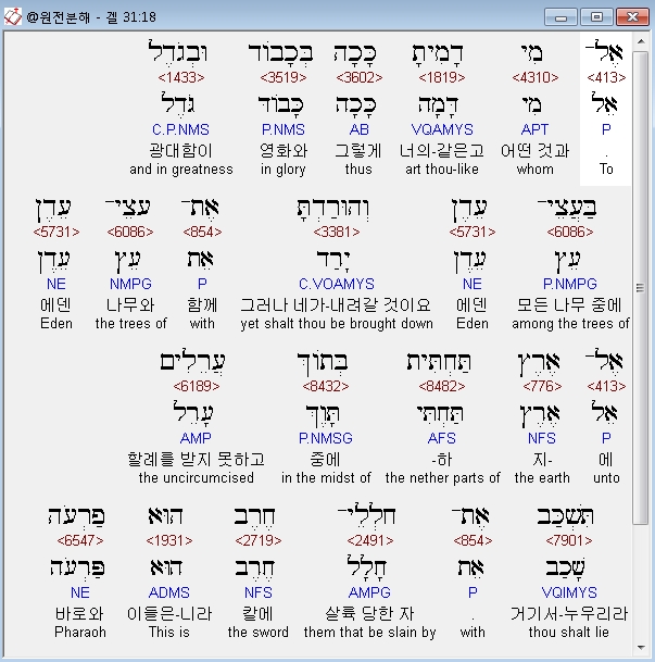 히브리어구약BHS,18 אֶל־מִי דָמִיתָ כָּכָה בְּכָבֹוד וּבְגֹדֶל בַּעֲצֵי־עֵדֶן וְהוּרַדְתָּ אֶת־עֲצֵי־עֵדֶן אֶל־אֶרֶץ תַּחְתִּית בְּתֹוךְ עֲרֵלִים תִּשְׁכַּב אֶת־חַלְלֵי־חֶרֶב הוּא פַרְעֹה וְכָל־הֲמֹונֹה* נְאֻם אֲדֹנָי יְהוִה׃ ס