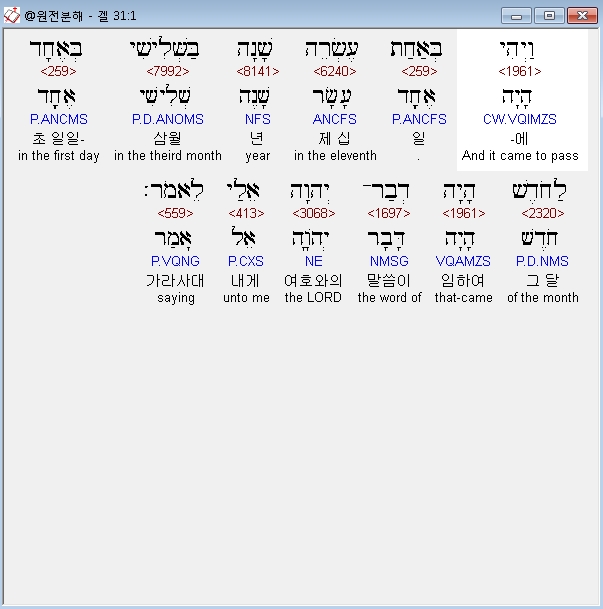 영어NASB,1 And it came about in the eleventh year, in the third month, on the first of the month, that the word of the LORD came to me saying,