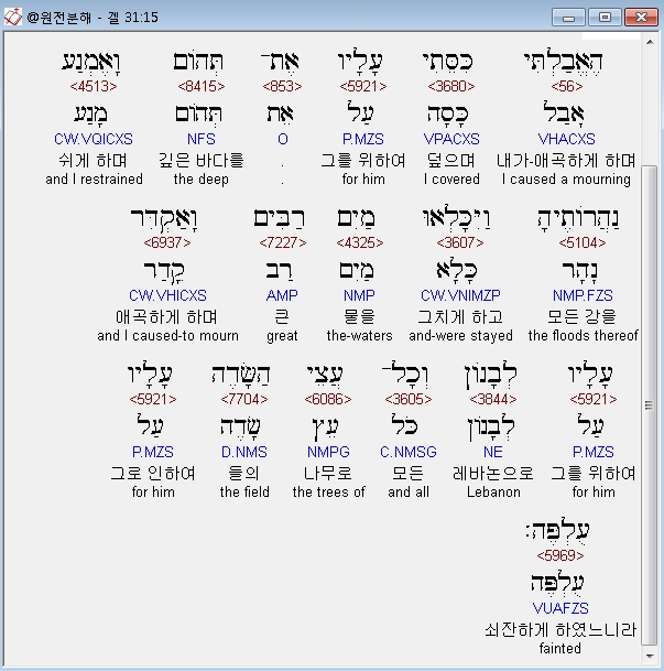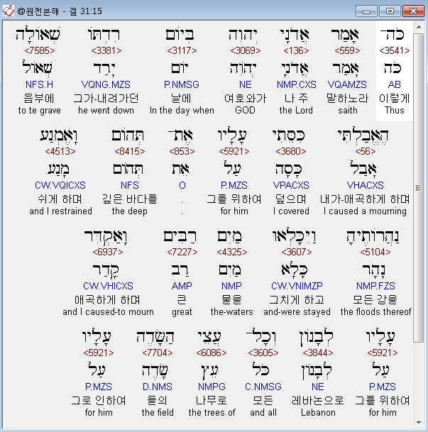 히브리어구약BHS,15 כֹּה־אָמַר אֲדֹנָי יְהוִה בְּיֹום רִדְתֹּו שְׁאֹולָה הֶאֱבַלְתִּי כִּסֵּתִי עָלָיו אֶת־תְּהֹום וָאֶמְנַע נַהֲרֹותֶיהָ וַיִּכָּלְאוּ מַיִם רַבִּים וָאַקְדִּר עָלָיו לְבָנֹון וְכָל־עֲצֵי הַשָּׂדֶה עָלָיו עֻלְפֶּה׃