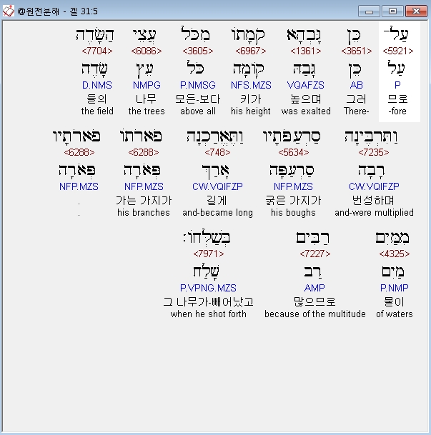 히브리어구약BHS,5 עַל־כֵּן גָּבְהָא קֹמָתֹו מִכֹּל עֲצֵי הַשָּׂדֶה וַתִּרְבֶּינָה סַרְעַפֹּתָיו וַתֶּאֱרַכְנָה [כ= פֹארֹתֹו] [ק= פֹארֹתָיו] מִמַּיִם רַבִּים בְּשַׁלְּחֹו׃