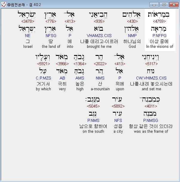 히브리어구약BHS,2 בְּמַרְאֹות אֱלֹהִים הֱבִיאַנִי אֶל־אֶרֶץ יִשְׂרָאֵל וַיְנִיחֵנִי אֶל־הַר גָּבֹהַּ מְאֹד וְעָלָיו כְּמִבְנֵה־עִיר מִנֶּגֶב׃