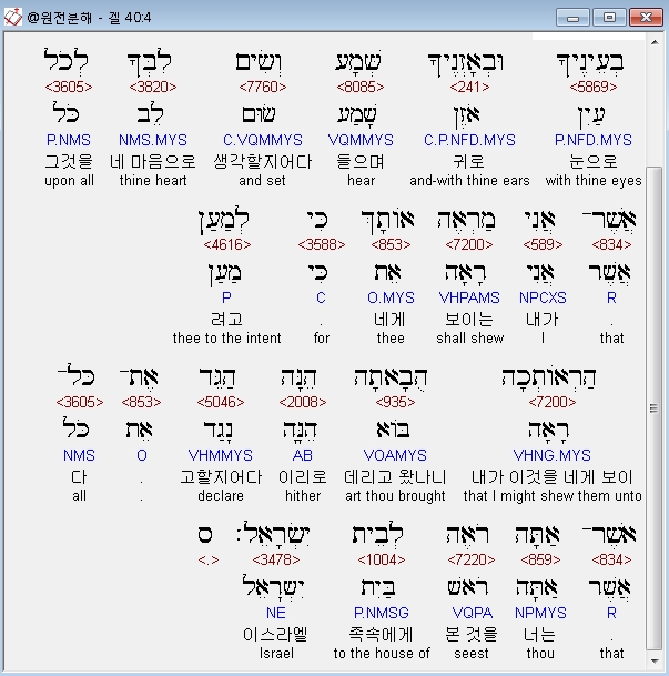 히브리어구약BHS,4 וַיְדַבֵּר אֵלַי הָאִישׁ בֶּן־אָדָם רְאֵה בְעֵינֶיךָ וּבְאָזְנֶיךָ שְּׁמָע וְשִׂים לִבְּךָ לְכֹל אֲשֶׁר־אֲנִי מַרְאֶה אֹותָךְ כִּי לְמַעַן הַרְאֹותְכָה הֻבָאתָה הֵנָּה הַגֵּד אֶת־כָּל־אֲשֶׁר־אַתָּה רֹאֶה לְבֵית יִשְׂרָאֵל׃