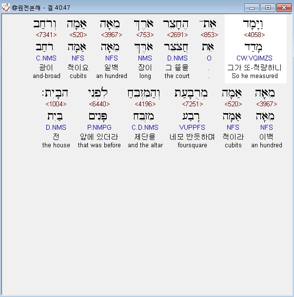 히브리어구약BHS,47 וַיָּמָד אֶת־הֶחָצֵר אֹרֶךְ מֵאָה אַמָּה וְרֹחַב מֵאָה אַמָּה מְרֻבָּעַת וְהַמִּזְבֵּחַ לִפְנֵי הַבָּיִת׃