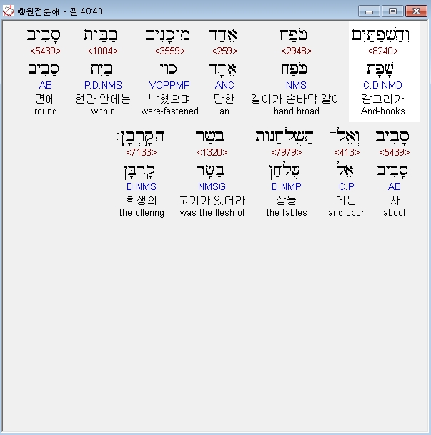 히브리어구약BHS,43 וְהַשְׁפַתַּיִם טֹפַח אֶחָד מוּכָנִים בַּבַּיִת סָבִיב סָבִיב וְאֶל־הַשֻּׁלְחָנֹות בְּשַׂר הַקָּרְבָן׃