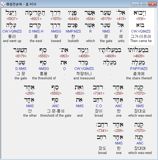 헬라어구약Septuagint,6 και εισηλθεν εις την πυλην την βλεπουσαν κατα ανατολας εν επτα αναβαθμοις και διεμετρησεν το αιλαμ της πυλης ισον τω καλαμω