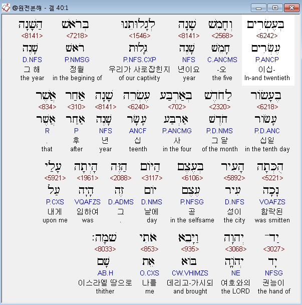 헬라어구약Septuagint,1 και εγενετο εν τω πεμπτω και εικοστω ετει της αιχμαλωσιας ημων εν τω πρωτω μηνι δεκατη του μηνος εν τω τεσσαρεσκαιδεκατω ετει μετα το αλωναι την πολιν εν τη ημερα εκεινη εγενετο επ' εμε χειρ κυριου και ηγαγεν με